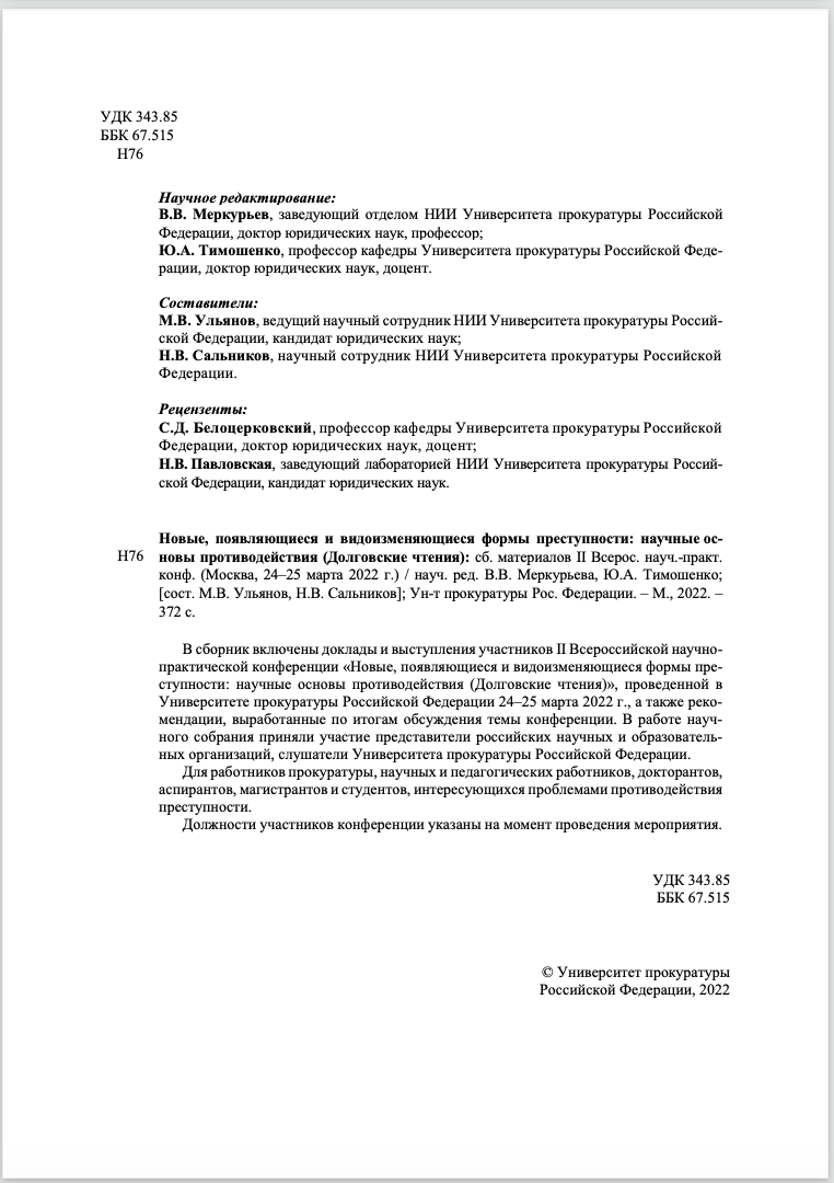 Новые формы прес-ти_Сборник_Долгов чтения_2022 Навигация по записям Монография “Судебная криминологическая экспертиза в антикриминальной политике государства” С.В. Кондратюк “Милитаризация и мобилизация Уголовного кодекса Российской Федерации (2022-2024 гг.): монография”