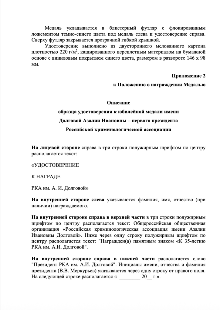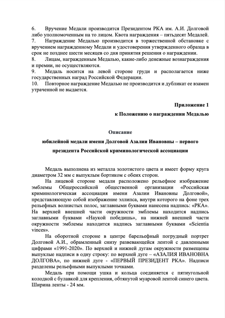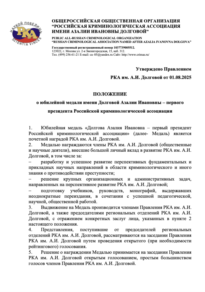 Одновременно с этим, представляем на рассмотрение проект Положения «О юбилейной медали имени Долговой Азалии Ивановны – первого президента Российской криминологической ассоциации» и будем признательны за Ваши комментарии. Мнение относительно проекта документа ожидается до 15 октября 2025 г. (включительно) на адрес электронной почты: valaytus@inbox.ru.