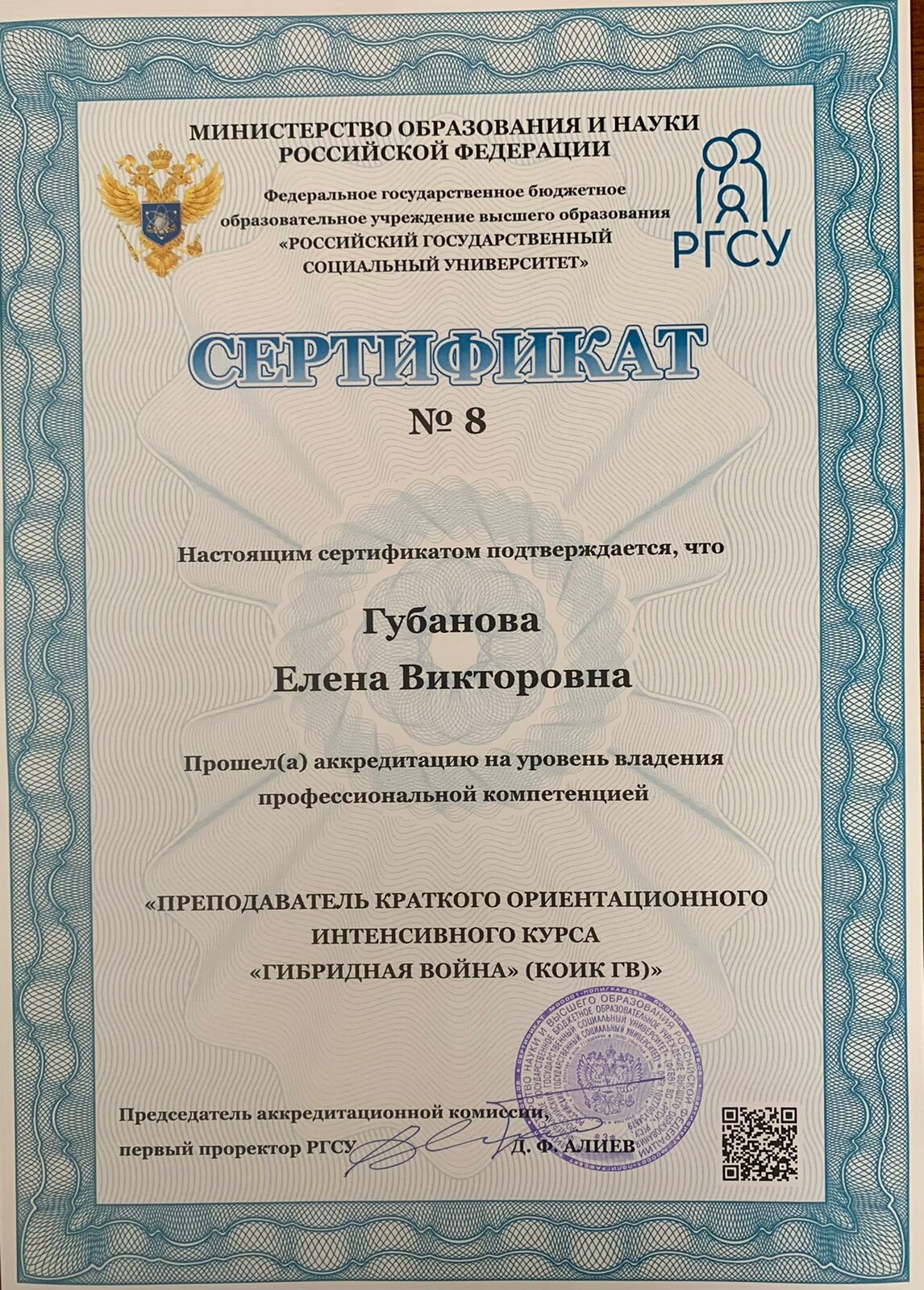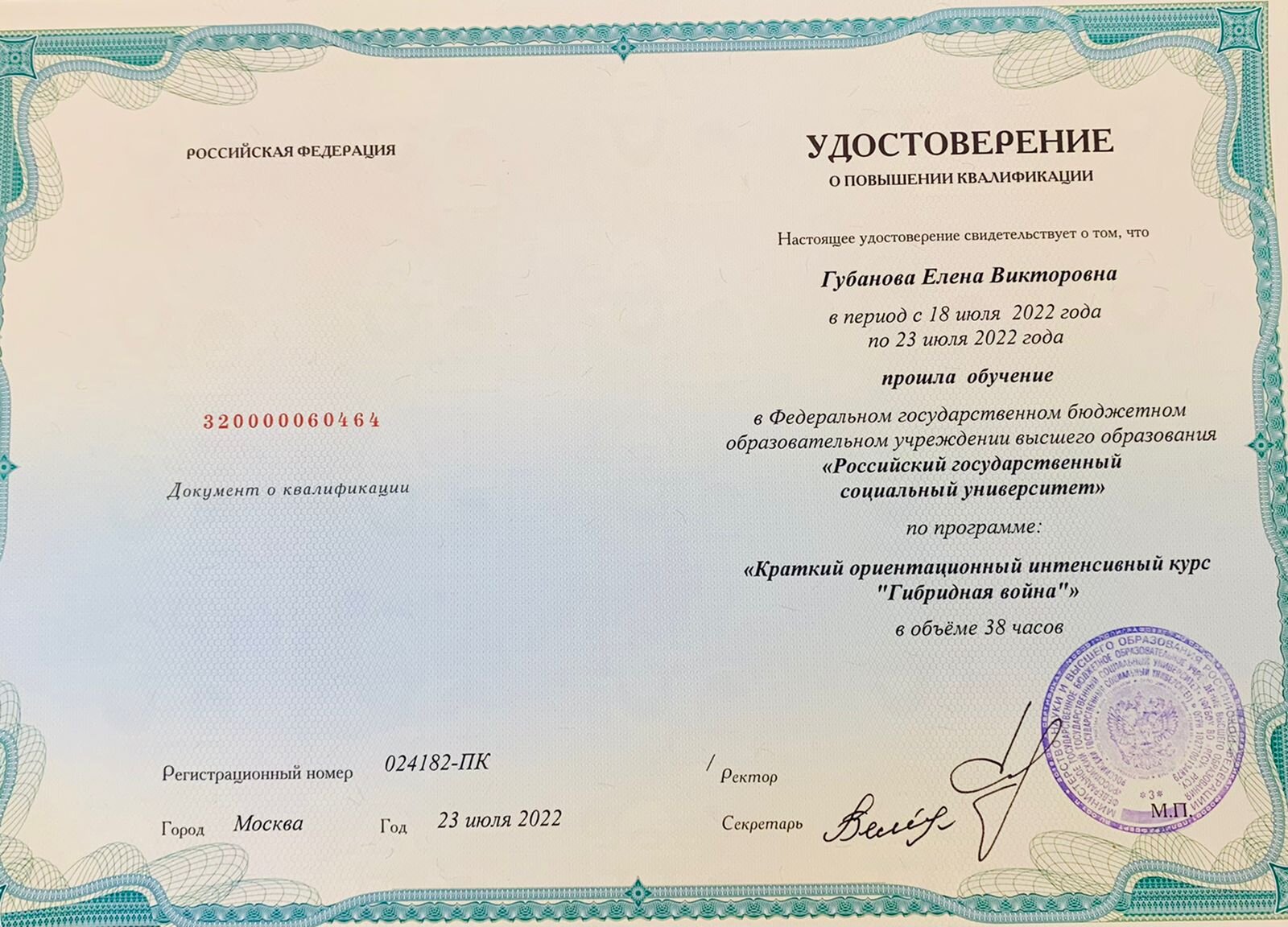 В Российском государственном социальном университете реализовано обучение по программе повышения квалификации ,,Гибридная война,,. Слушателями курса стали руководители и сотрудники Координационных центров, проректора по молодежной политике ведущих университете России. От Крымского федерального университета им. В.И. Вернадского прошла обучение с подтверждением права на реализацию данного учебного курса член Российской криминологической ассоциации им. А.И. Долговой, доцент кафедры уголовного права и криминологии, руководитель Координационного центра по вопросам формирования у молодежи активной гражданской позиции, предупреждения межнациональных и межрегиональных конфликтов, противодействия идеологии терроризма и профилактики экстремизма Губанова Елена Викторовна и Ефанов Владимир Юрьевич.